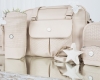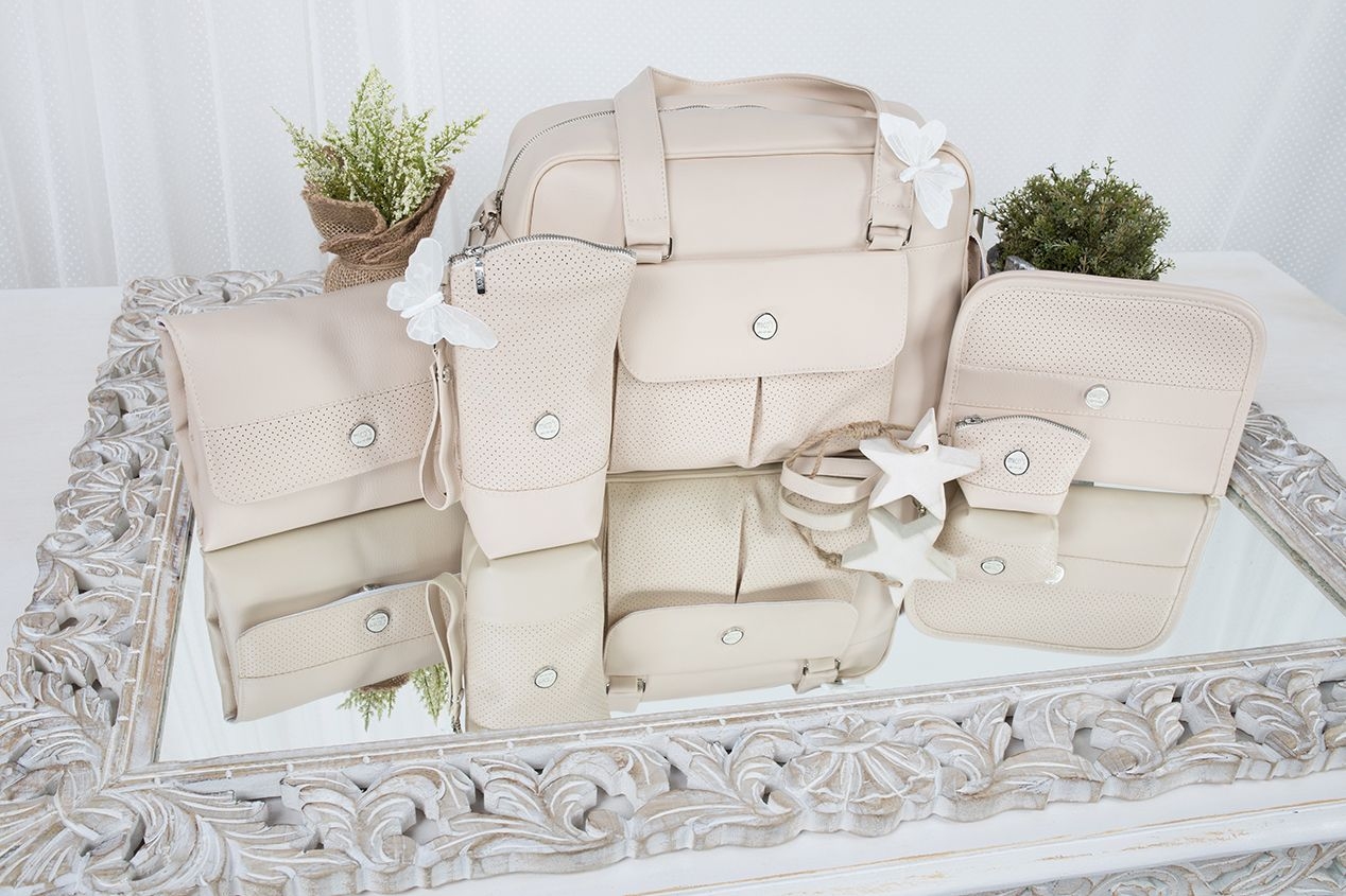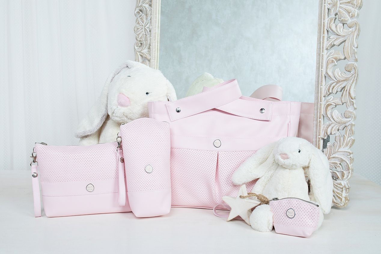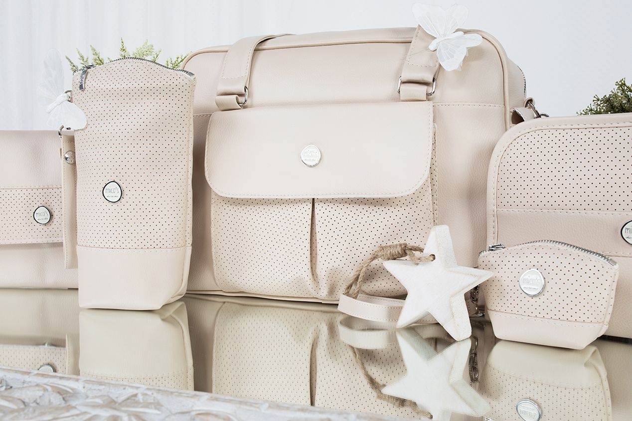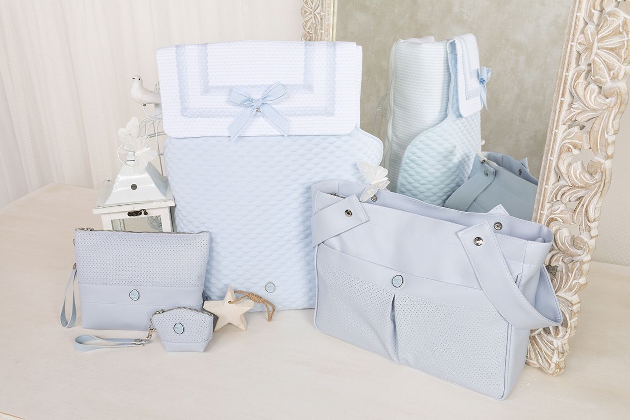 Delicada colección realizada en una combinación de tejidos suaves y naturales. Sus complementos en una cuidada polipiel le dan un toque de actualidad irresistible para las mamis más modernas.