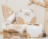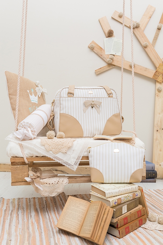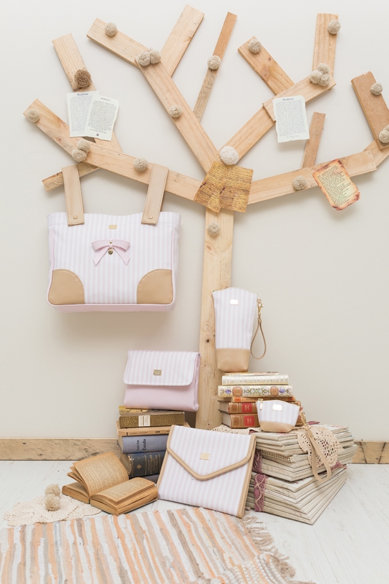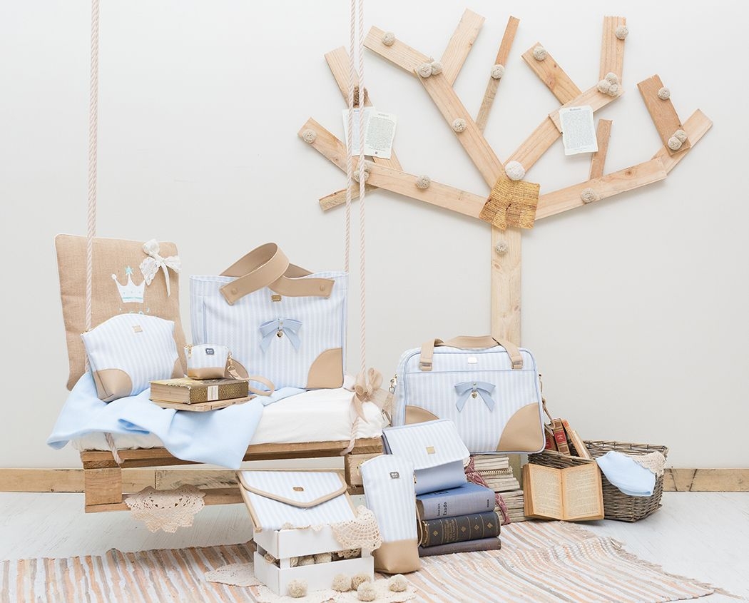 Estampado de rayas y topitos con jacquard y bolillos, junto con sus complementos de polipiel estampados, crean una colección dulce y delicada para los mas peques de la casa.